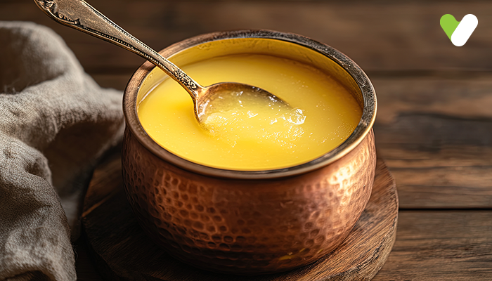 Ghee is a form of refined butter which originates from India and is frequently used in Middle Eastern, Pakistani, and Indian cuisine. Ghee is often used in cooking and frying because of its high smoke point, which means it can be heated to a high temperature without burning. It is also used in many traditional Indian dishes for its rich flavour and aroma. Ghee is sometimes used as a substitute for butter or oil in recipes and is also used in some traditional Ayurvedic practices for its effective health benefits. Ghee health benefits include improving digestion, reducing inflammation, boosting brain function, etc.