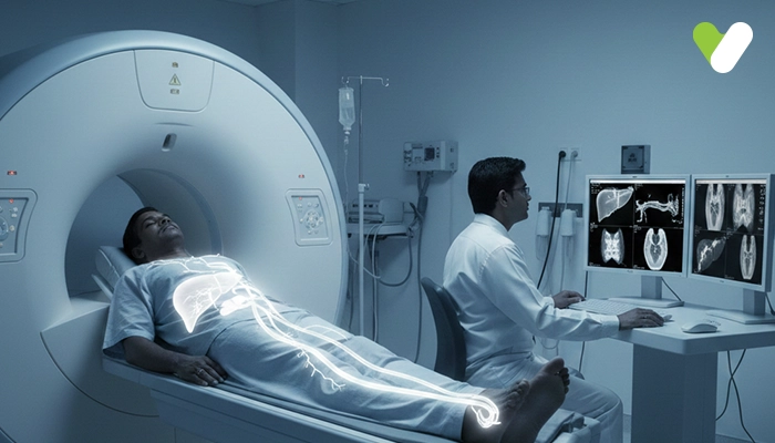 Magnetic resonance cholangiopancreatography (MRCP), a magnetic resonance imaging (MRI) procedure, offers precise pictures of the pancreatic and hepatobiliary systems, which can be used to study the organs such as the gallbladder, liver, bile ducts, pancreatic duct, and pancreas. Doctors use magnetic resonance imaging or MRI, a safe procedure, to identify medical disorders. MRCP scan creates the precise image of the interior of the body by using a strong radiofrequency pulse, a magnetic field, and a computer. Radiation (x-ray) isn't used during a MRCP test. Doctors may inspect the body and find diseases with the help of detailed MR pictures.An intravenous (IV) line is used to inject a dye inside your veins for this procedure. The dye, also known as a contrast medium, aids in creating the clear pictures of your internal organs as well as the tubes connecting them. The findings help your healthcare provider in the diagnosis and treatment planning of a disease. Since the MRCP test is a non-invasive examination, no objects need to be inserted into the patients to obtain the pictures.