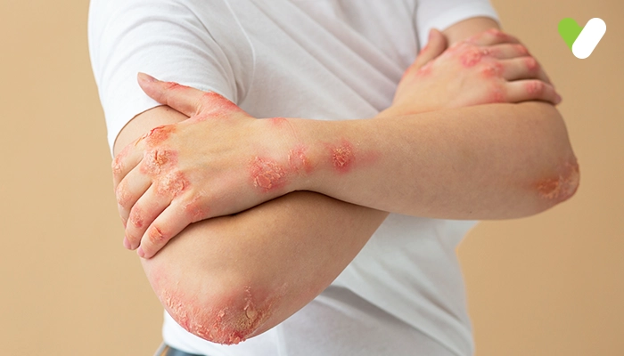 Psoriasis is a rash or a chronic autoimmune skin condition that causes skin build-up into rough red patches covered with white scales. It is a skin disorder where the skin cells multiply faster than usual, growing deep in your skin and slowly rising to the surface to fall off eventually. Psoriasis symptoms usually appear on the scalp, elbows, knees, and lower back. However, they can develop in other areas of your body, like the hands, feet, neck, scalp, and face. Psoriasis can occur in members of the same family.
