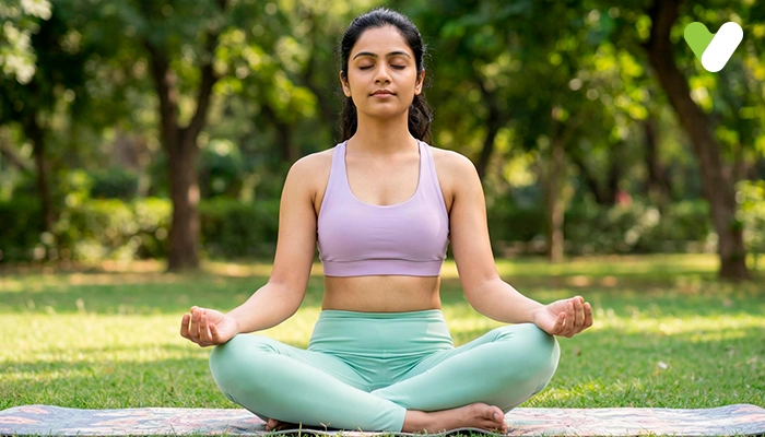 Follow these steps to perform the posture:- Sit on your mat with your knees bent and the soles of your feet touching each other.