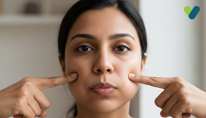 - Cheek lifter: To begin, create a round shape with your mouth by making an ‘O’ with your lips. Then, gently rest your upper lip on your top row of teeth. Next, give a smile while placing your fingers softly on top of your cheeks. Finally, relax your muscles and bring down your smile. Repeat this exercise as needed.