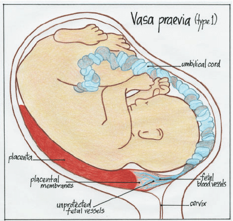 The term “vasa” comes from Latin, meaning “vessels”, the term “pre” meaning before, and the term “via” meaning way. In simpler words, the vessels that lie before the fetus. These vessels lie in the birth canal, “in the way” of the fetus’s exit.